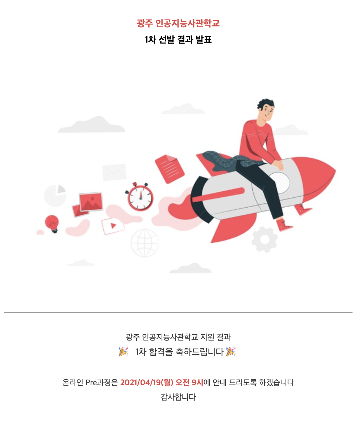 스마트인재개발원 IoT기반 Web 개발자(Java) 과정을 마치고 막학기를 다니고 있던 중 인스타에서 광주 인공지능사관학교 홍보 영상을 보게 되었다. 인공지능보다는 웹이나 백엔드에 관심이 많았던 나는 그냥 지나칠 뻔 했지만 코드라이언 수업 받아볼 수 있다는 생각에 지원하게 되었다. 지원서를 제출하고 1차 선발 결과를 기다리고 있던 4월 15일 합격했다는 메일을 받았다. 4월 19일부터 온라인 Pre 과정을 들었다.