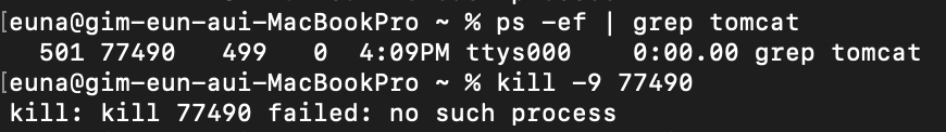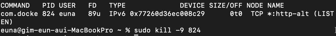 확인한 PID를 입력하여 실행중인 포트를 중지시켜주면 된다.