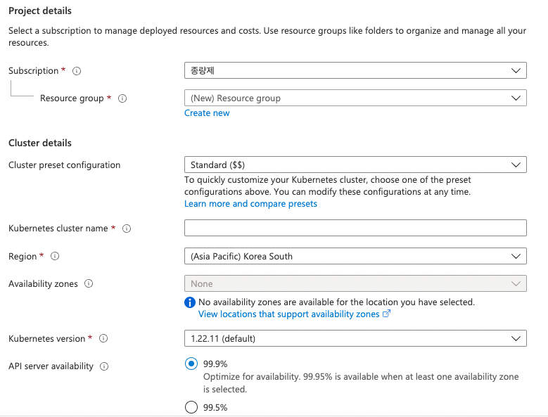 2. Kubernetes cluster name에 myAKS 같은 이름을 설정해주세요.