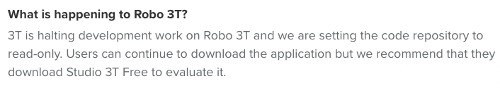 공식문서를 찾아보니 Robo3T 대신 Studio 3T를 다운로드 받는 것은 권장하고 있다.