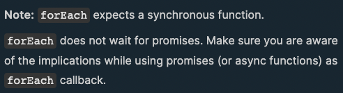 이유는 바로 forEach 함수는 콜백 함수로 비동기 함수를 받더라도 실행을 기다려주지 않는다고 합니다!