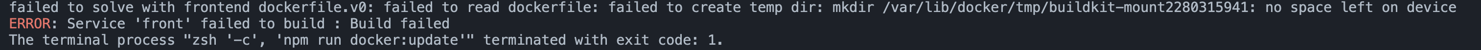 많은 build 과정으로 인해 안쓰는 image, container, volume 등이 쌓여 더이상 build를 할 수 있는 공간이 없어 생긴 문제였다.