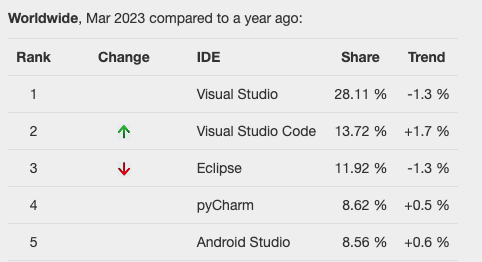 VSCode는 Top IDE index에서 무려 2위를 달성할 정도로 많은 개발자들이 사용하는 툴입니다.