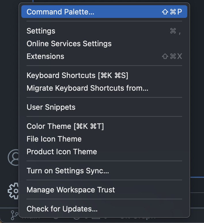 왼쪽 하단에 있는 톱니바퀴를 누르시거나 단축키를 사용하셔서 Command Palette에 들어가주세요.