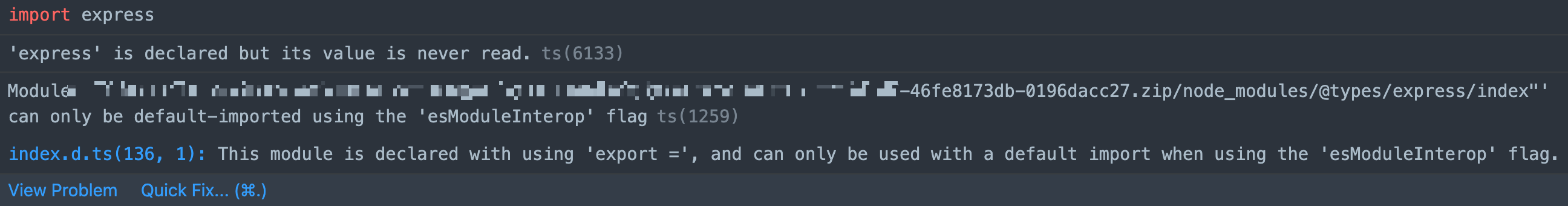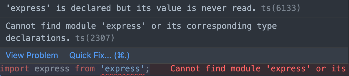 명령어로 파일을 돌려보니 Cannot find module 'express' or its corresponding type declarations. 라는 새로운 오류를 만났다.