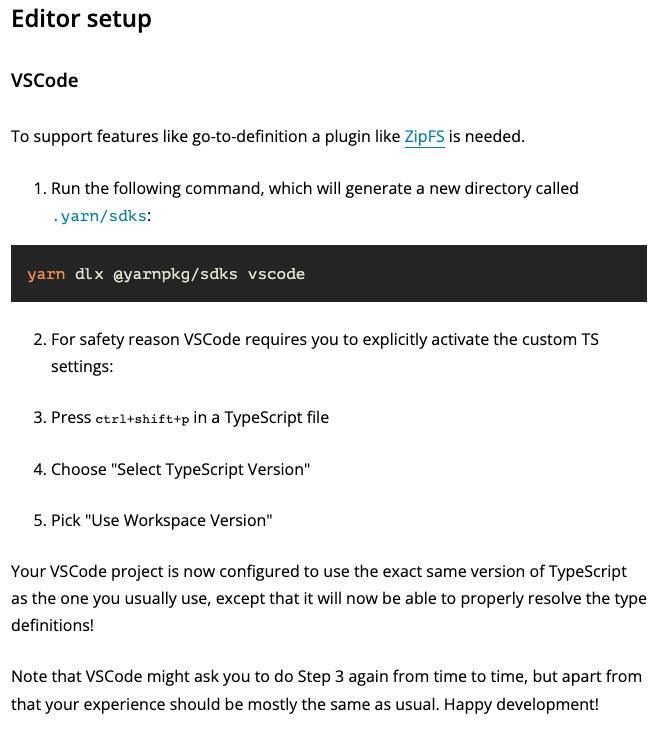 yarn 공식문서에서 가져왔는데 보면 알겠지만 VSCode에서 yarn을 사용하기 위해서는 위와 같은 절차가 필요하다.
