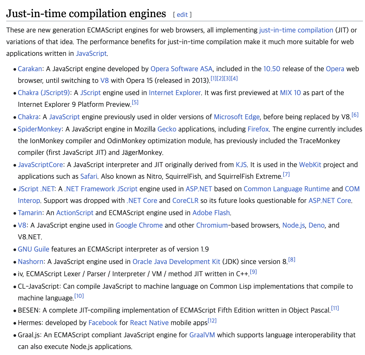 대중적으로 알려진건 구글의 V8 엔진인데 크롬에서 사용중이며 NodeJS에서도 쓰인다.