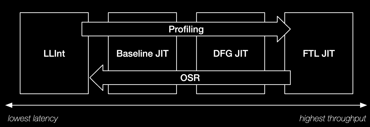 JSC의 JIT 아키텍처는 LLInt, Baseline JIT, DFG JIT, FTL JIT이다.