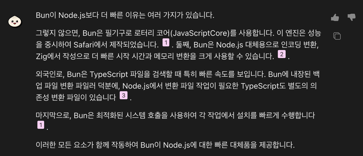 그래서 이거저거 찾아보다가 Bun 공식 페이지에 AI로 물어보는게 있어서 사용해봤다.