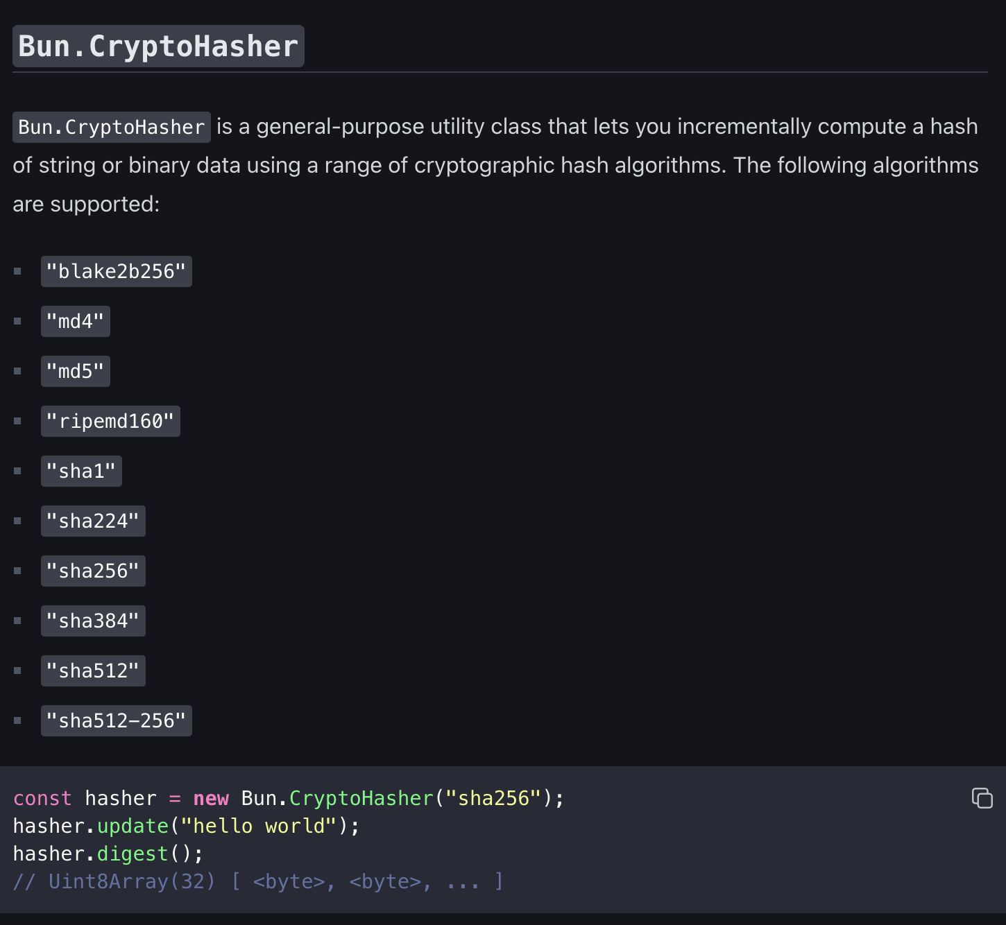 const hasher = new Bun.CryptoHasher("sha256");