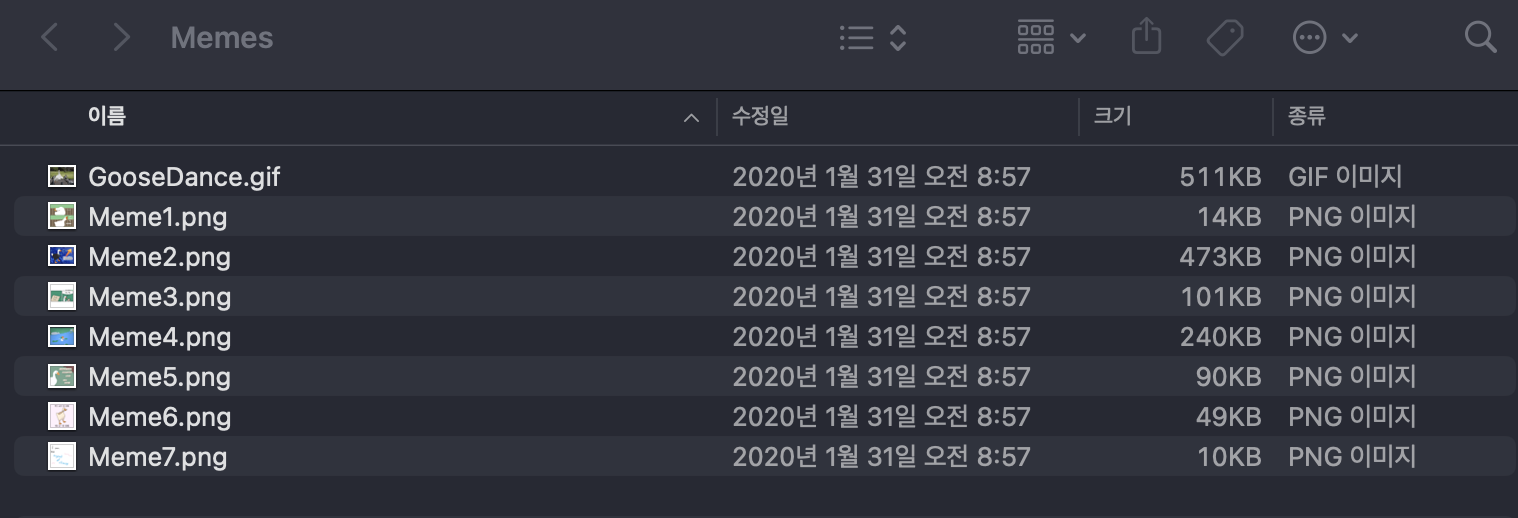 open memes folder을 누르면 지금까지 랜덤하게 나왔던 밈들을 볼 수 있다.