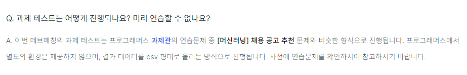 FAQ 모음을 보니 과제 테스트를 통해 미리 연습을 할 수 있다는 것을 알게 되어습니다. 이틀 밖에 남지 않았지만 과제란에서 [머신러닝] 채용 공고 추천 문제를 통해 미리 연습을 해보야 할 것 같네요.