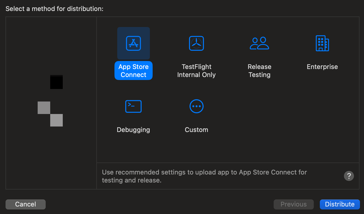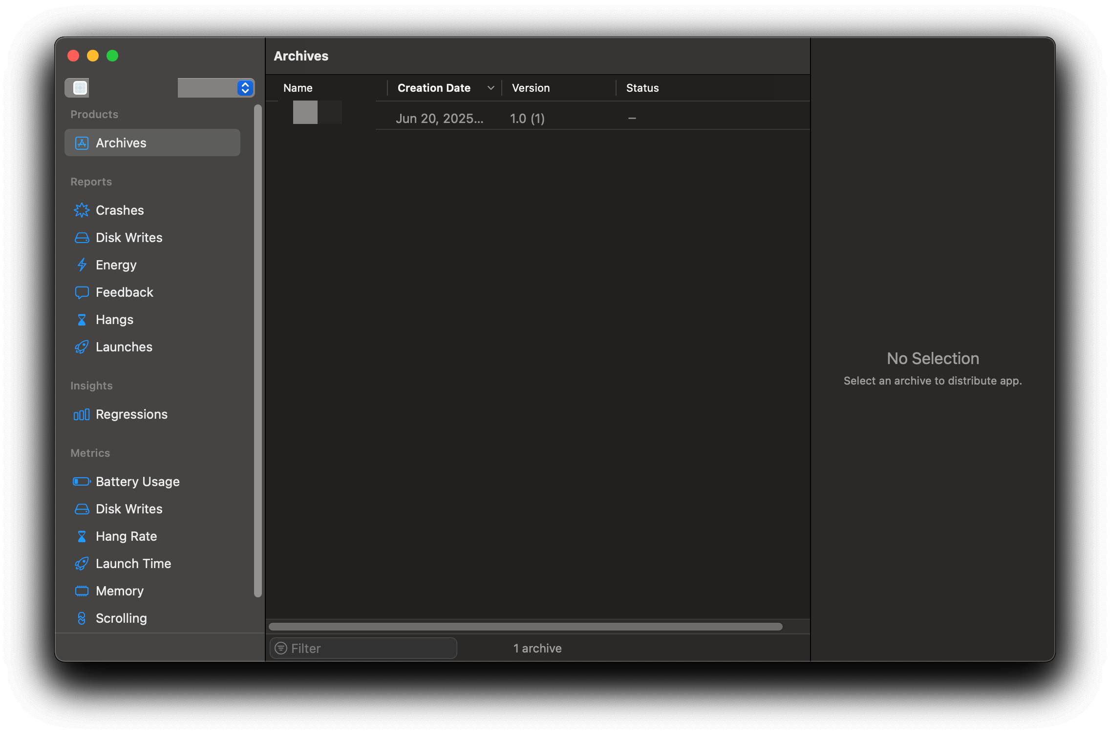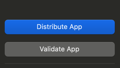 Archives에서 앱 선택하면 오른쪽 패널에 Distrivute App 버튼이 나온다