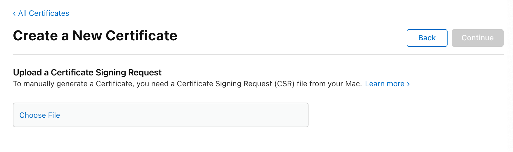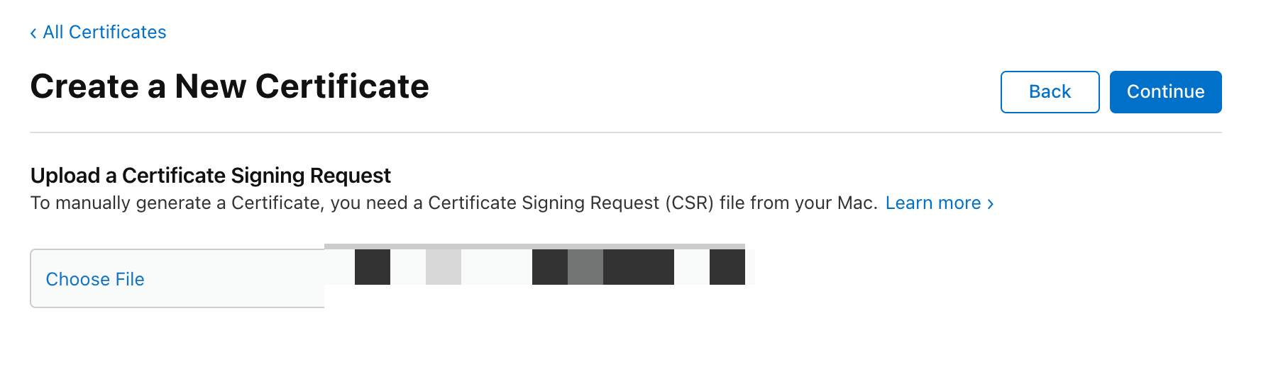 컴퓨터에 CSR 파일이 생겼으면 다시 Apple Developer로 가서 파일을 넣어주면 된다