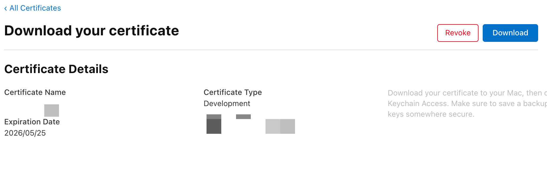 완료가 되면 Certificate Type이 잘 나왔는지 확인하고 Download를 클릭