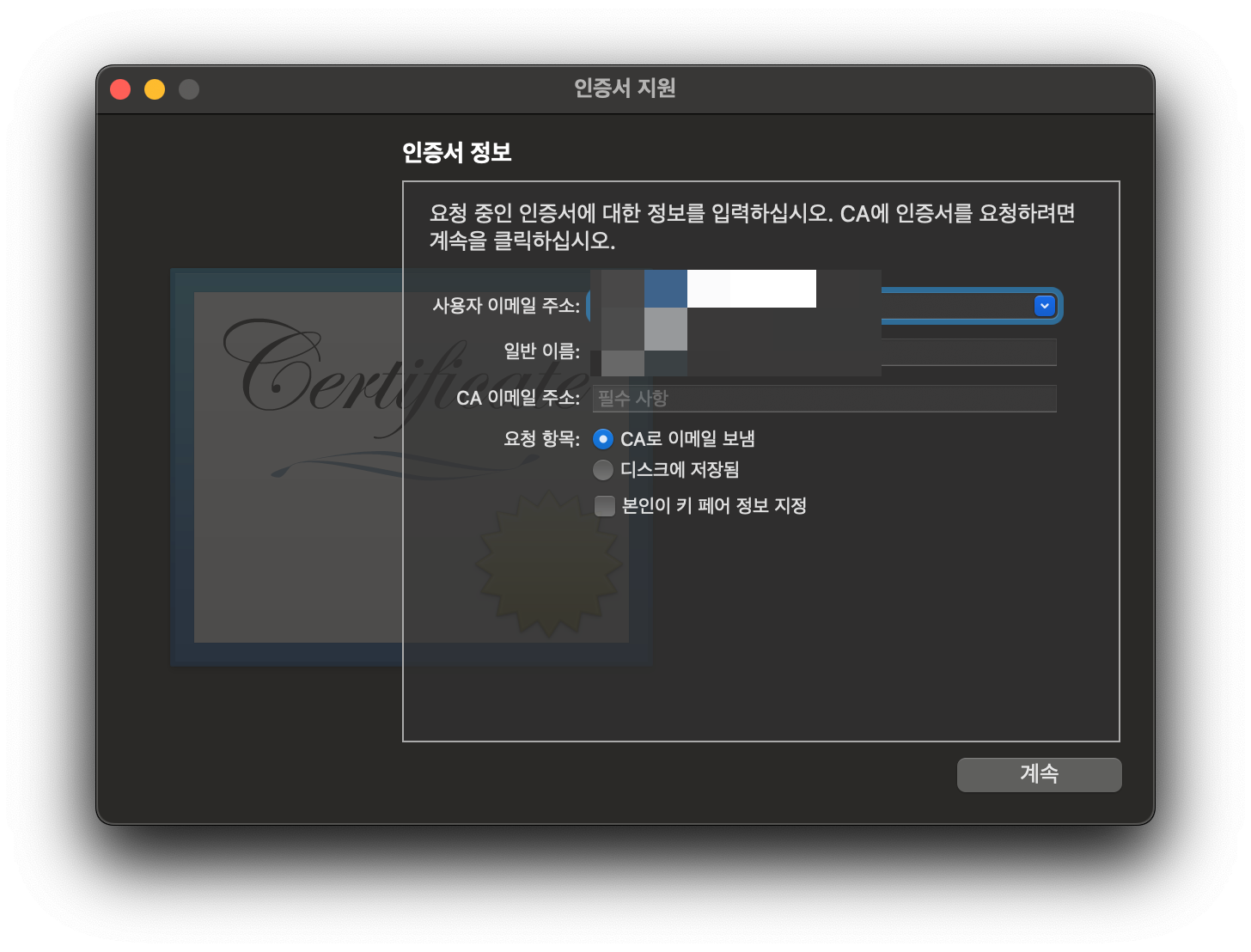 키체인 접근 > 인증서 지원 > 인증기관에서 인증서 요청을 클릭
