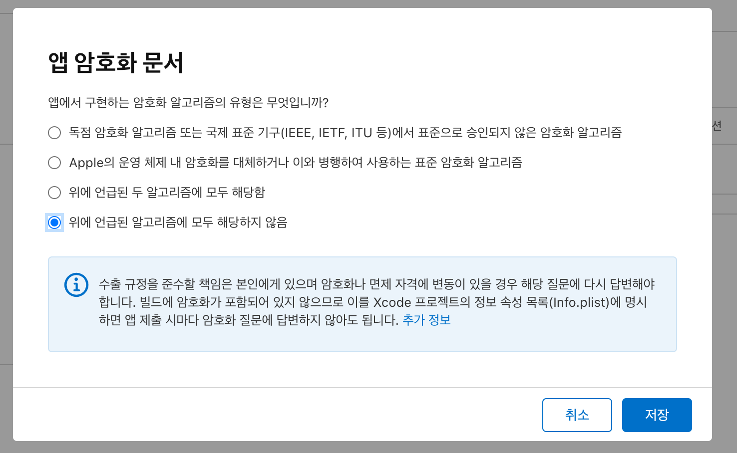 눌러보니FestFlight 업로드 후 반드시 한 번 거쳐야 하는 암호화 수출 규정 질문이다