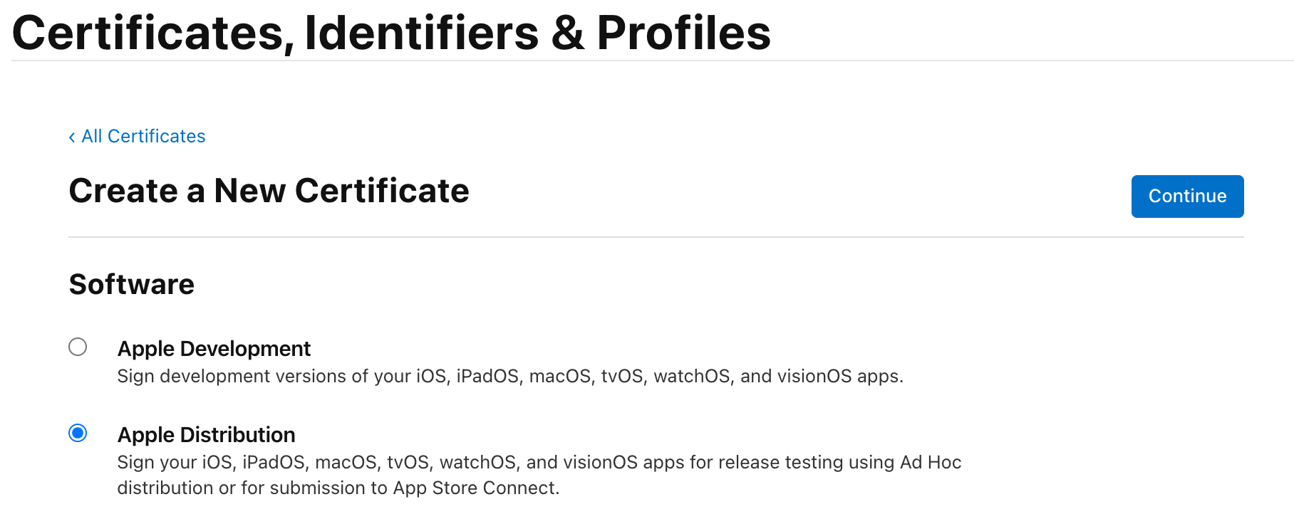 Apple Distribution 선택 후 Continue 클릭