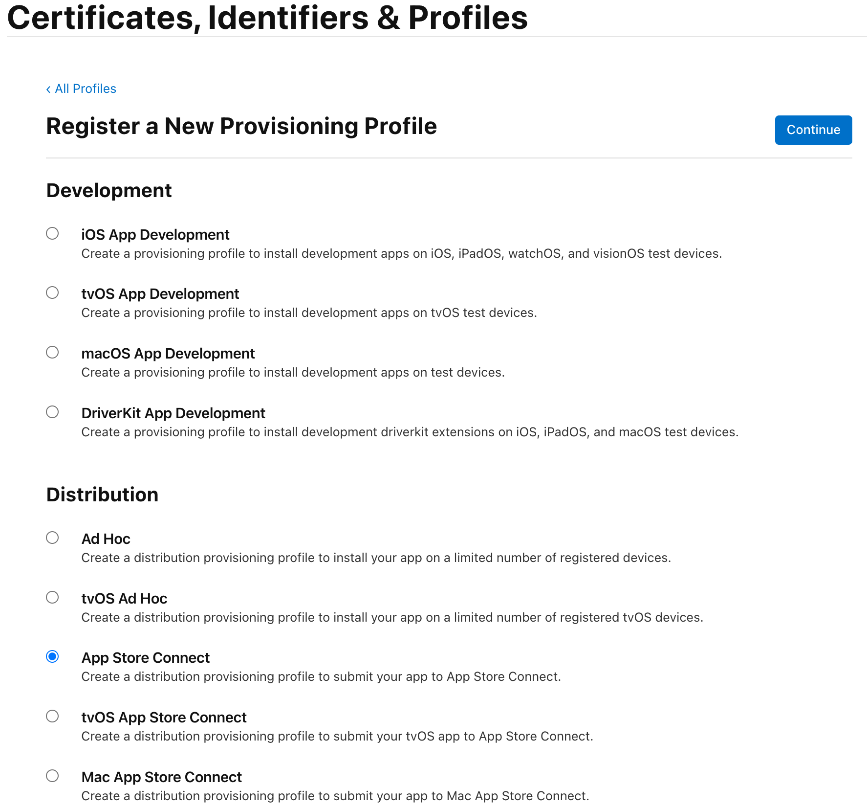 App Store Connect 선택 후 Continue