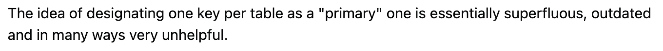 그러나 난 무조건 기본 키가 있어야 한다고 생각했다. 중복은 어떻게 하고, 참조는 어떻게 할 것인지 이해가 되지 않았기 때문이다. 하지만 이 생각은 위 글을 보고 나서 다시 한 번 생각하게 됐다. 첫 문장부터 파격적이다. 각 테이블마다 하나의 키를 "기본" 키로 지정한다는 아이디어가 불필요하며, 시대에 뒤떨어졌으며, 여러면에서 도움이 되지 않는다고 한다.