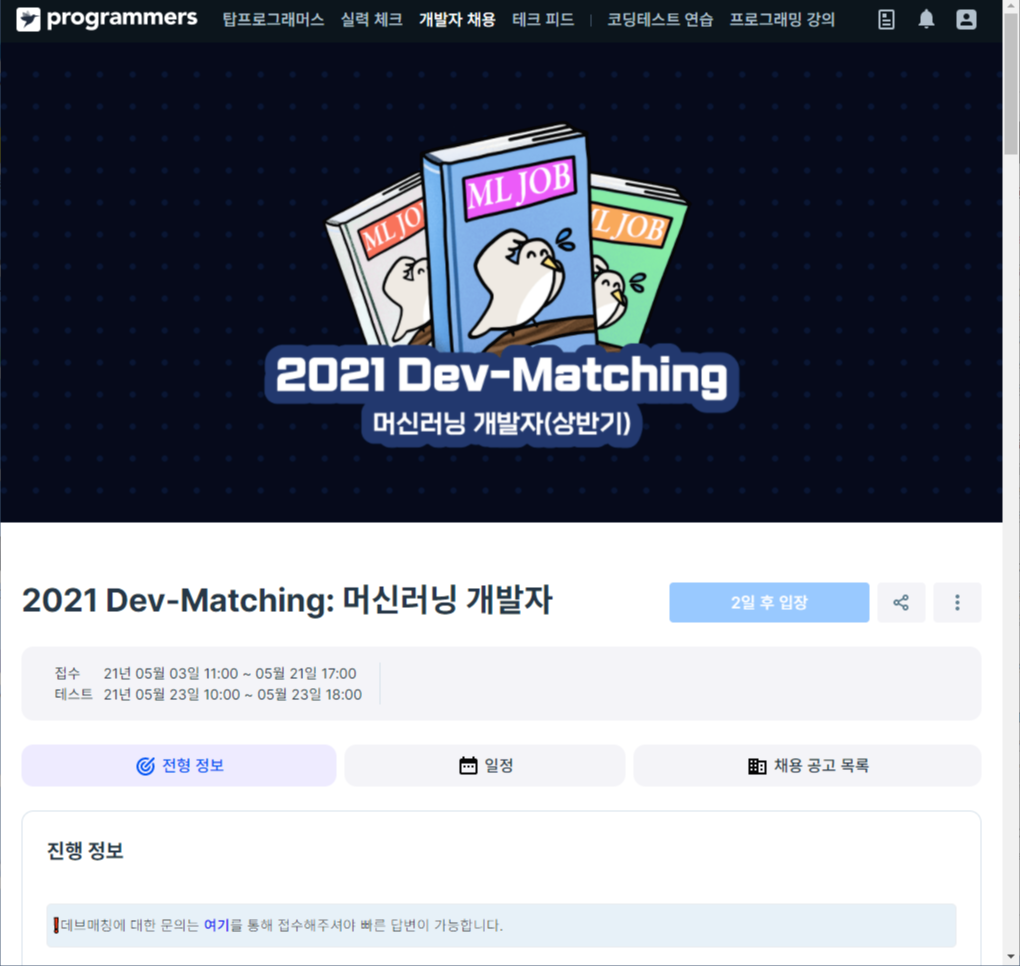 programmers 2021 Dev-Matching: 머신러닝 개발자 채용 프로그램를 접수했고 채용 공고에서 포지션을 보며 총 5개의 기업에 지원했습니다.