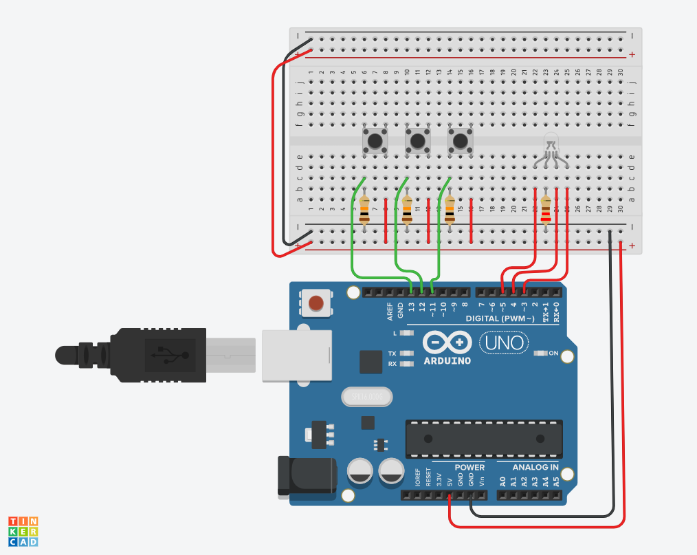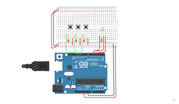 Arduino Uno R3, 누름 버튼, 10kΩ 레지스터, LED RGB, 220Ω 레지스터