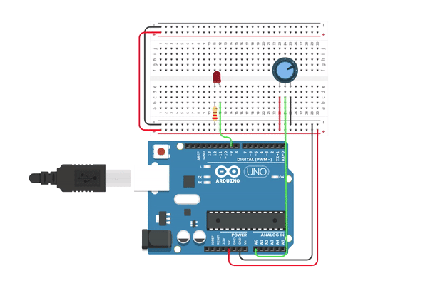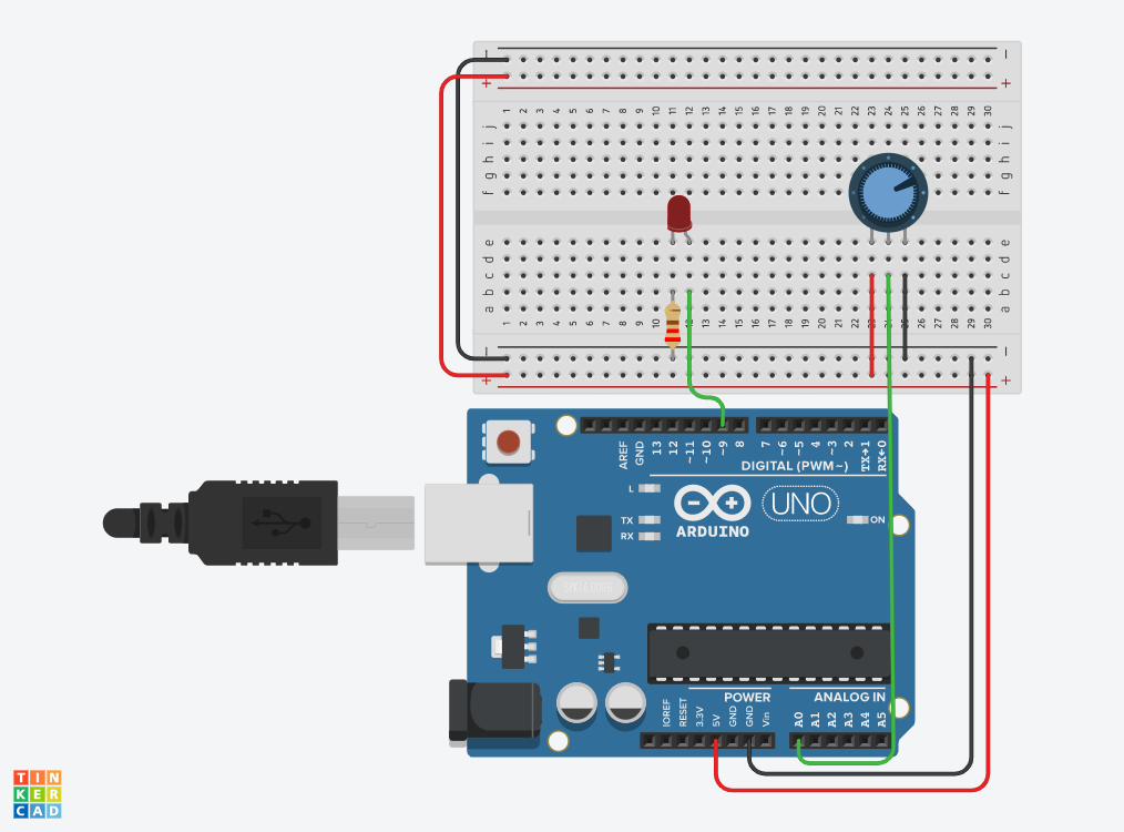 Arduino Uno R3, 250kΩ 분압기, 빨간색 LED, 220Ω 레지스터