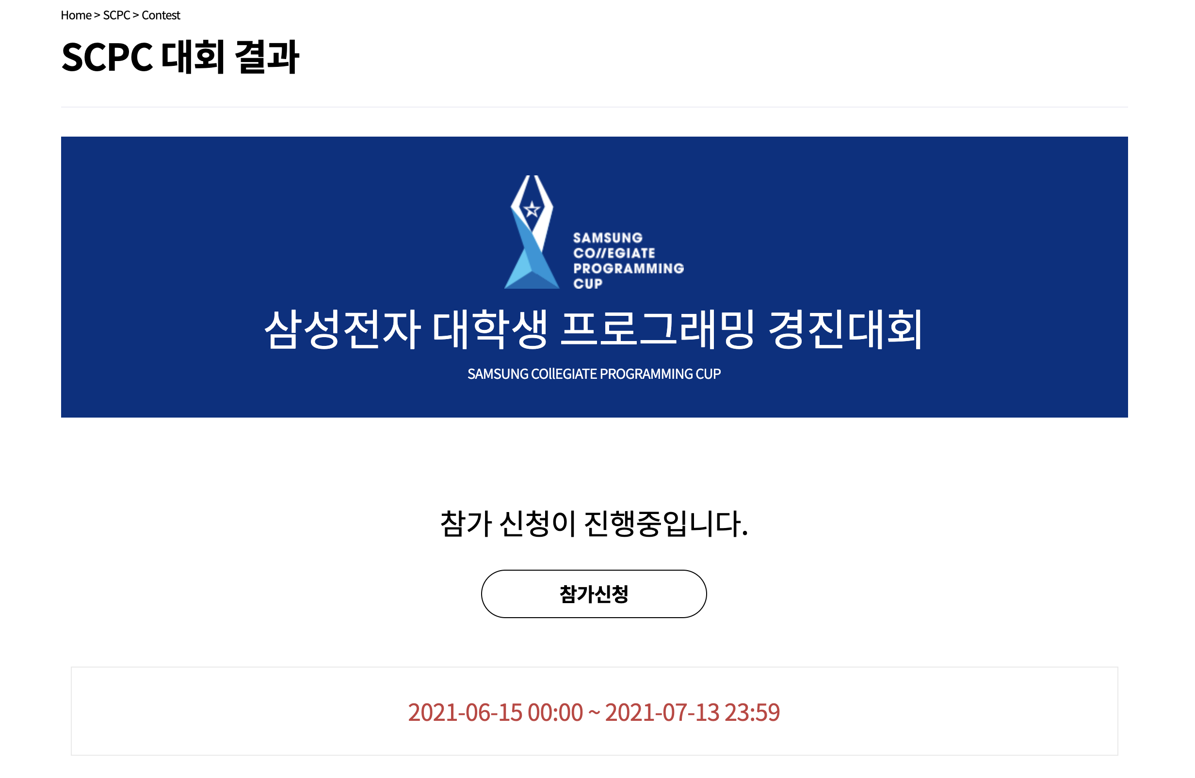 Samsung Collegiate Programming Cup 즉, SCPC는 삼성전자에서 2015년부터 진행해온 프로그래밍 경연입니다. 그렇다보니 국내 최대 규모이며 대학생 누구나 전공, 학년 제한 없이 참가할 수 있습니다. 최근에서야 알게 되었는데 전공자들 사이에서는 유명한 대회더라고요. 졸업반이라 참가할 수 있는 조건이 올해 밖에 되지 않아서 아쉽네요. 경진대회 접수는 삼성리서치 홈페이지에서 할 수 있습니다. SCPC 참가접수를 누르고 간단한 정보를 입력하면 접수가 완료되니 간단해서 좋네요.