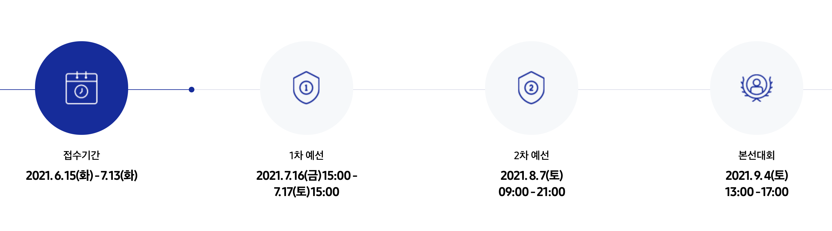 6월 15일부터 7월 13일까지 약 한 달 동안 참가신청을 받아요. 참가신청 기간이 넉넉해서 많은 분들이 참가하실 수 있을 것 같아요. 1차 예선과 2차 예선 그리고 본선대회가 열립니다. 확실히 우수 인재를 발굴하기 위해서 3번이나 시험을 보네요. 본인이 대학생이라면 1년에 한 번씩 참가하면서 도전해보면 좋은 결과 있을 것 같아요. 비전공자라면 실력이 부족하다는 생각에 망설이실수도 있지만 한 번 코딩 테스트 경험이라도 해보자라는 생각으로 신청해보세요. 그리고 1차 예선까지 알고리즘 공부를 하시면 됩니다! 많이 못 푸실 수도 있지만 대회 준비하면서 알고리즘 공부도 하고 어떤 유형으로 시험이 출제되는지 알 수도 있습니다.