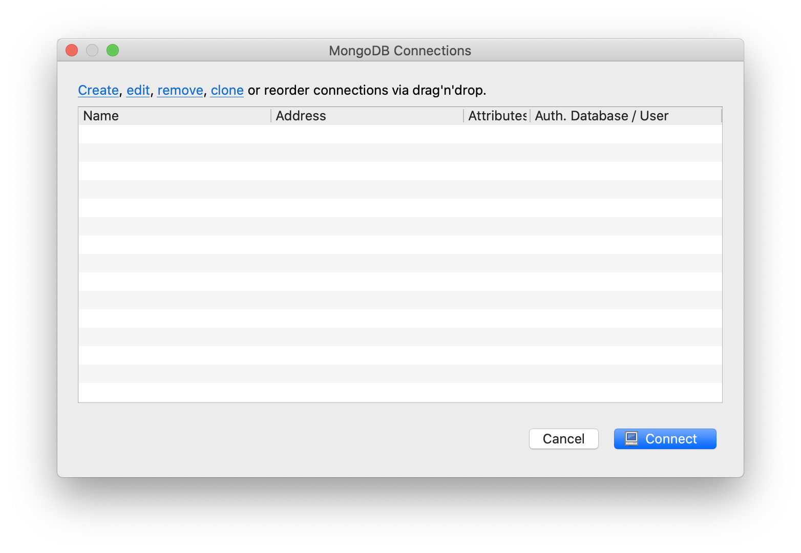 잘 설치가 마무리 되었다면 MongoDB를 만들 수 있는 창이 나온다. Create 누르면 DB를 만들 수 있다! MongoDB는 데이터 베이스이지만 사람 눈에는 보이지 않는다. 그렇기 때문에 Robo 3T를 이용해서 MongoDB 데이터를 시각화해서 볼 수 있는 것이다.