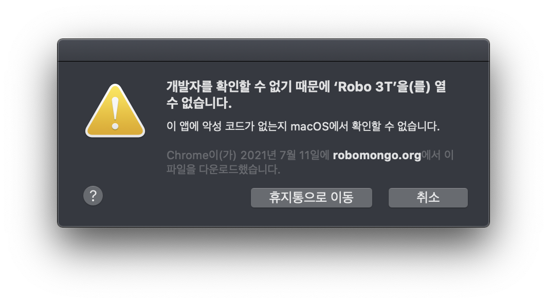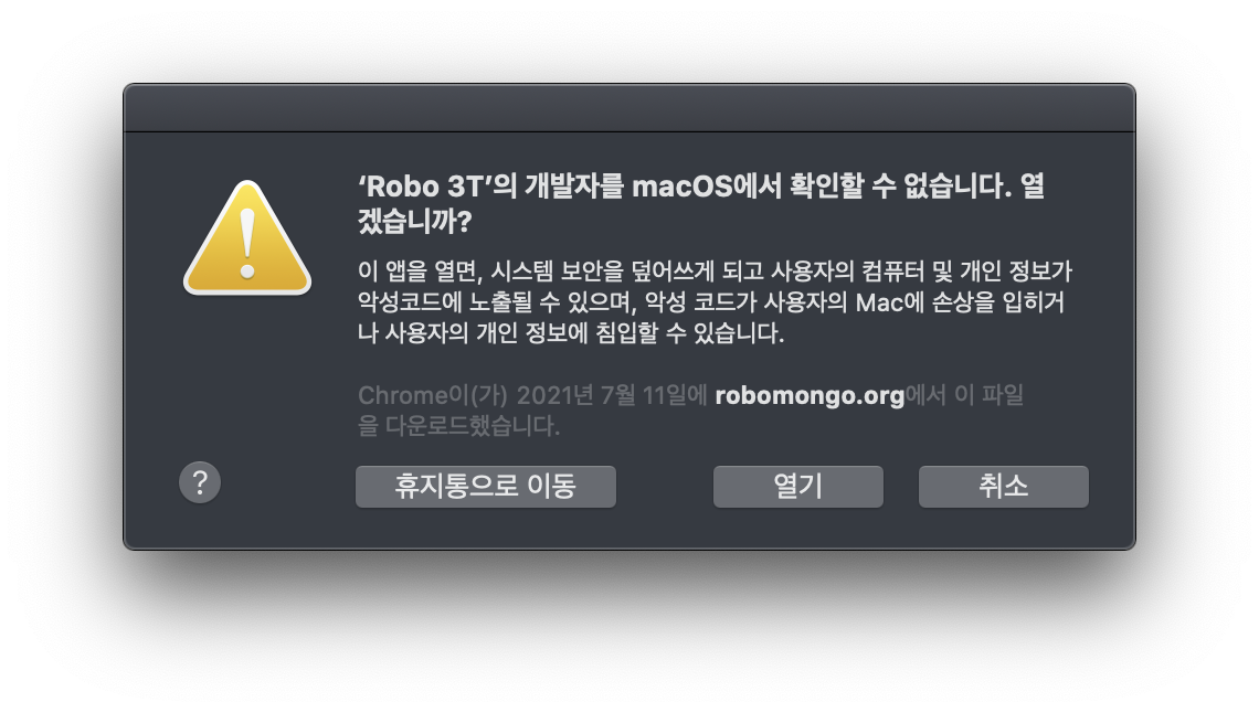그런데 '개발자를 확인할 수 없기 때문에 'Robo 3T'을(를) 열 수 없습니다.' 라는 창이 나왔다. 휴지통으로 이동과 취소 밖에 없기 때문에 빠르게 구글링을 했다. 해결방법은 생각보다 간단하고 쉬웠다.