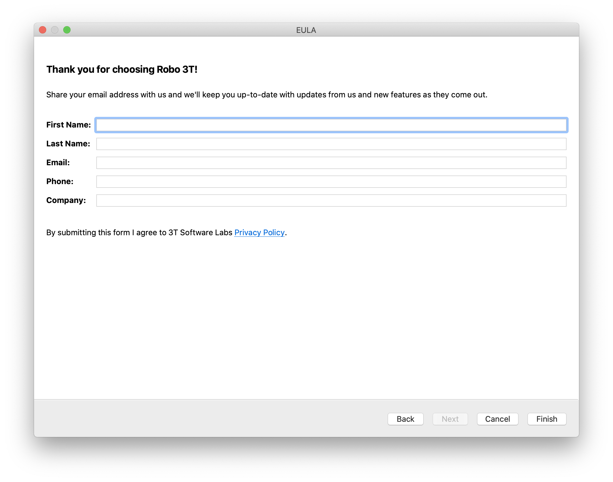 열기를 눌렀다면 왼쪽과 같이 정책 동의창이 뜬다. 동의를 누르고 다음으로 넘어가면 오른쪽과 같이 Thank you for choosing Robo 3T가 나오는데 아무것도 쓰지 않고 Finish 누르면 끝!