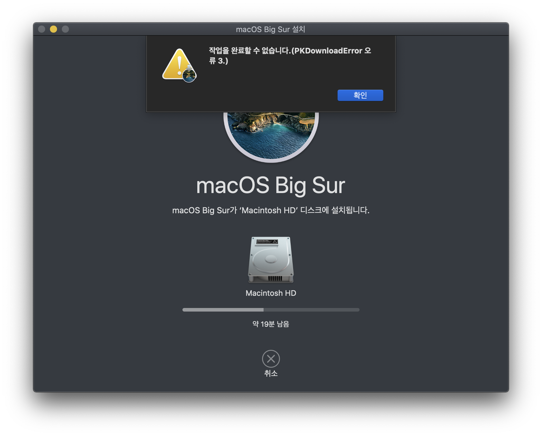 설치가 잘 되던 중 '작업을 완료할 수 없습니다. PKDownloadError오류 3.'이라는 메시지와 함께 중지되었어요.