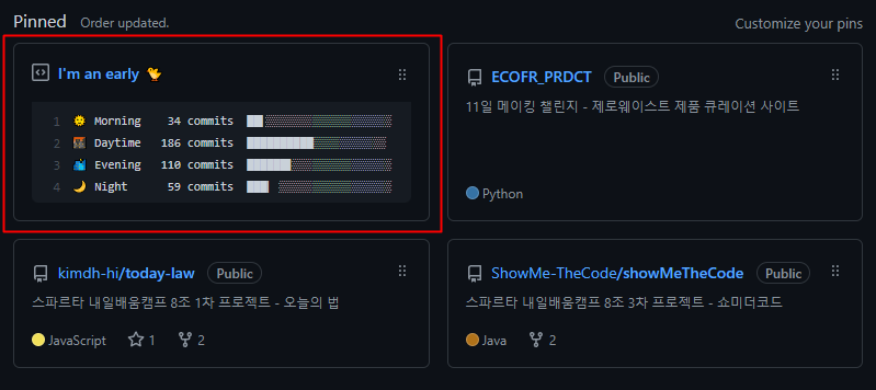Pinned에 예쁘게 잘 꾸미기 적용되었네요.