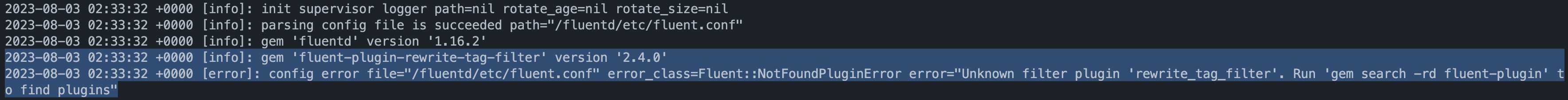 fluentd 로그를 확인해보니 Unknown filter plugin 'rewrite_tag_filter'. Run 'gem search -rd fluent-plugin' to find plugins 라는 문구가 보인다.