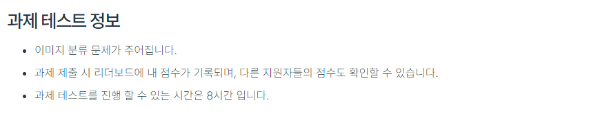 이번 채용 프로그램의 목적은 과제 테스트를 통해 제 레벨을 체크하기 위함입니다. 과제 테스트 정보를 보면 이미지 분류 문제가 주어진다고 하네요. 과제 테스트가 8시간 동안 진행되니 다 못풀더라도 할 수 있는데까지 포기하지 않고 풀어볼 생각입니다.