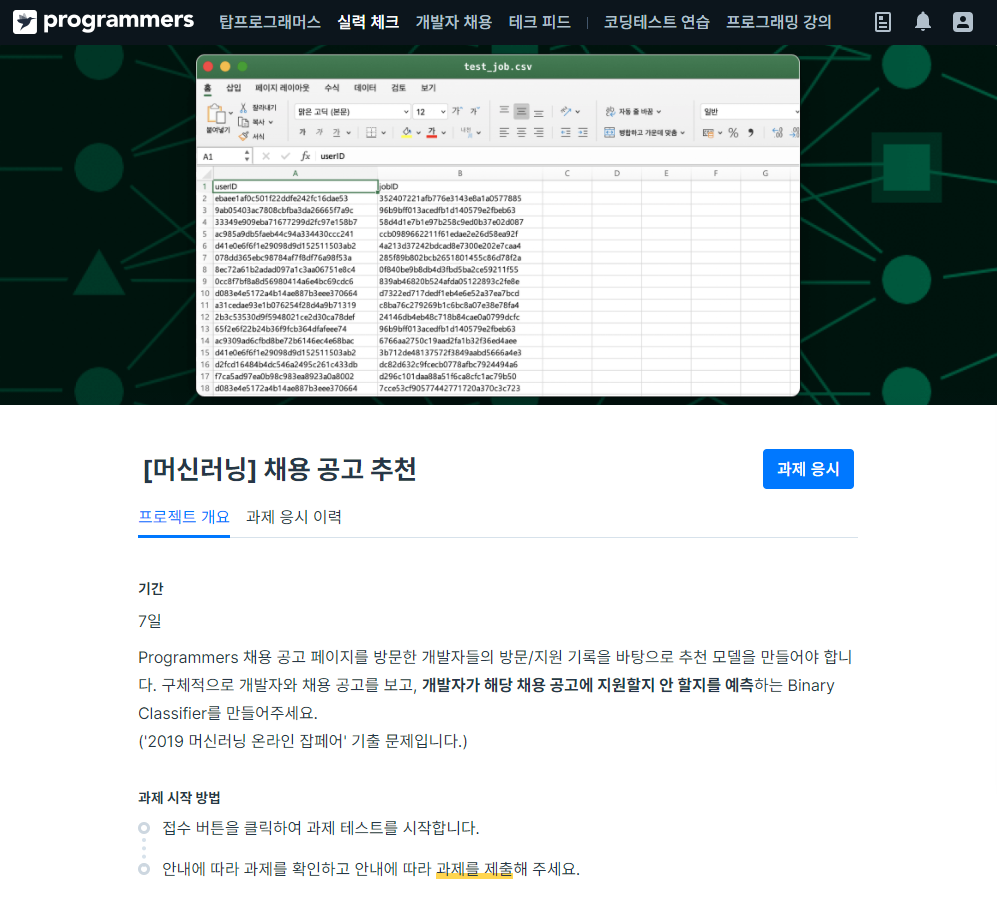 FAQ 모음을 보니 과제 테스트를 통해 미리 연습을 할 수 있다는 것을 알게 되어습니다. 이틀 밖에 남지 않았지만 과제란에서 [머신러닝] 채용 공고 추천 문제를 통해 미리 연습을 해보야 할 것 같네요.